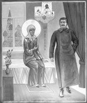 РЕДАКЦИЯ МИТ: Адресуем в красную газету “Завтра” к интервью МПешного игумена Евстафия Жакова – человека, безусловно, полусумасшедшего от помрачения в сатанизме безблагодатной МП, отчего он считает людоеда Сталина верующим в Бога, а также демонски рассказывает об истории нижеследующего дьявольского изображения: