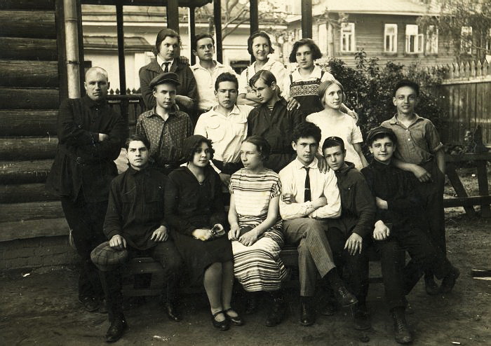 3 июня 1927 года: типичный московский двор на Бутырке – 17-летний Севин папа Кирилл Пулин (во втором ряду четвертый слева в темной рубашке с выглядывающей тельняшкой) с одноклассниками и учителем литературы (во втором ряду первый слева)