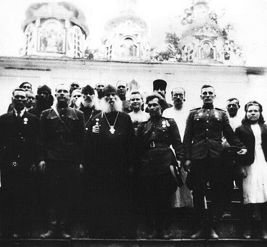 Псково-Печерский монастырь, 1944 год. Бывшее советское духовенство, затем – гитлеровско-власовской Псковской православной миссии, теперь -- Московской патриархии с советскими офицерами. Настоятель монастыря игумен Павел (Горшков) в нижнем ряду в центре между двумя офицерами Красной армии.